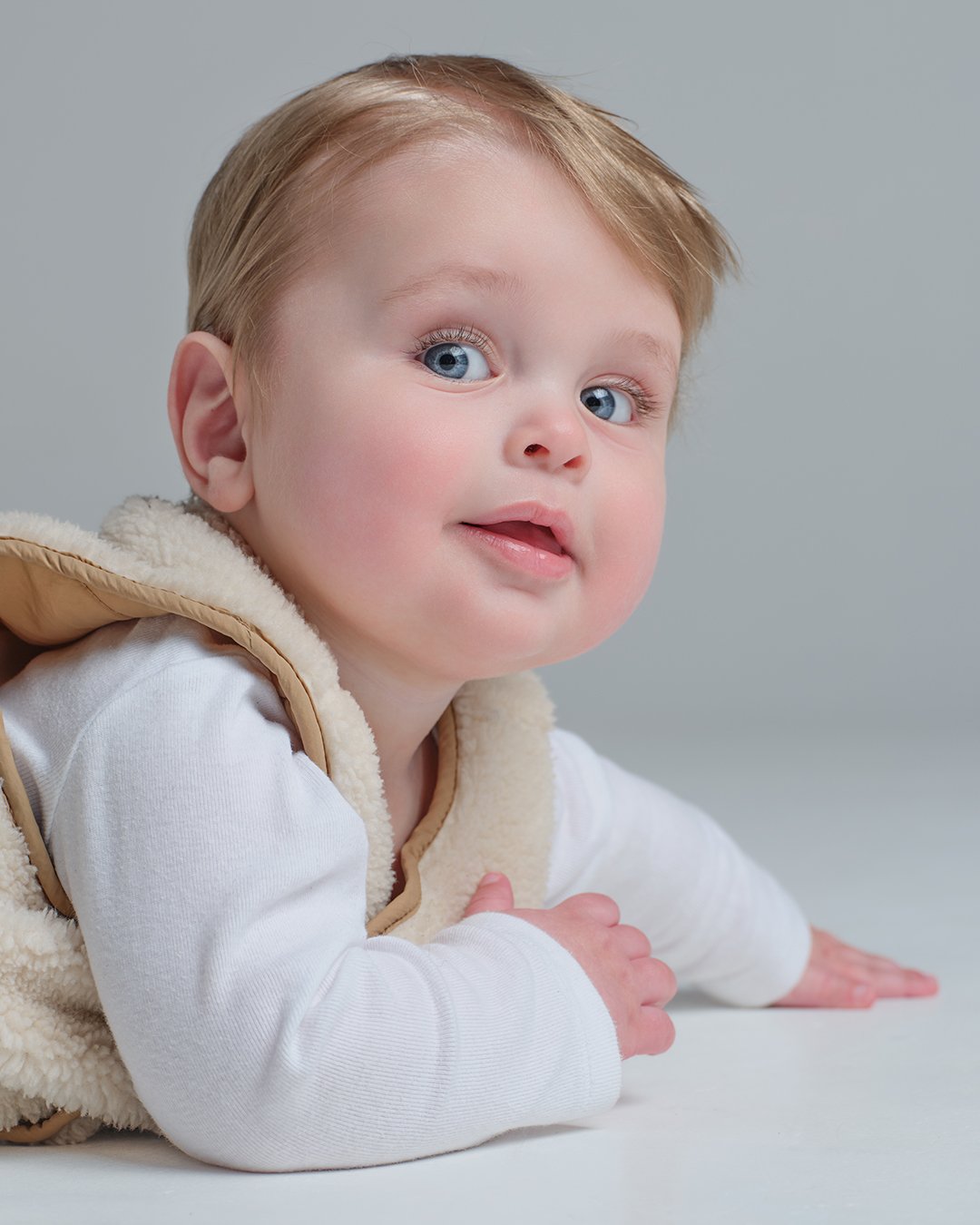 A curious toddler with blue eyes and blonde hair wears a white long sleeve shirt and a tan sherpa vest, posing on their stomach against a neutral studio background.